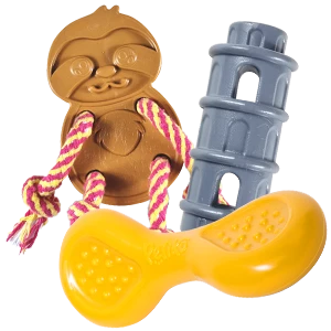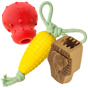 Os tipos de brinquedos que seu cachorro vai receber dependem da trilha de experiência escolhida. Esses são os tipos que a Petiko envia: brinquedos interativos para rechear, pelúcias, mordedores de borracha, mordedores de nylon, cordas 100% algodão e comedouros interativos.
